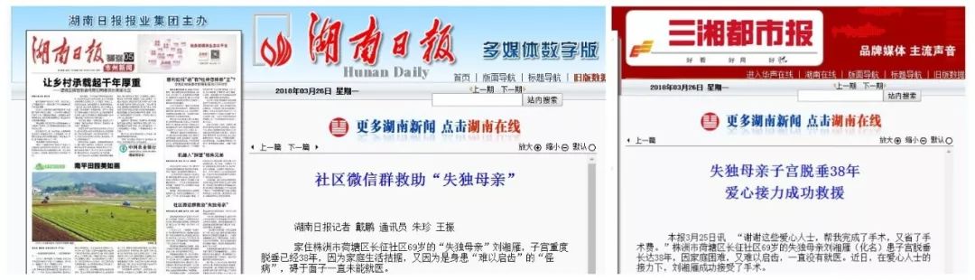 2018年3月23日,株洲新興醫(yī)院免費(fèi)為子宮重度脫垂且患有多重病癥的69歲貧困失獨(dú)母親劉湘雁(化名)老人實(shí)施陰式子宮全切術(shù),解決了困擾了她38年之久的"煩惱“。湖南日報、三湘都市報等主流媒體對此次公益事件進(jìn)行了重點(diǎn)報道。