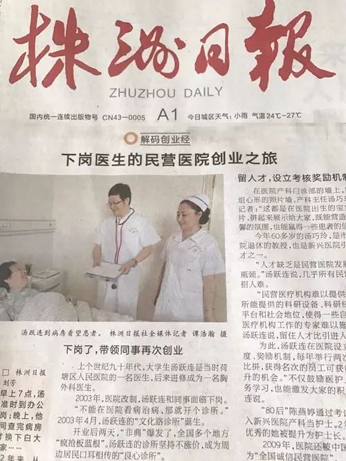 2017年6月17日,在新興醫(yī)院建院12周年過后的不久,受株洲日報及紅網(wǎng)在線之邀,兩家媒體分別對株洲市新興醫(yī)院責任有限公司總經(jīng)理湯躍連的創(chuàng)院事跡,作為榜樣進行重點報道,傳遞了新興醫(yī)院的創(chuàng)院精神與整體風貌。