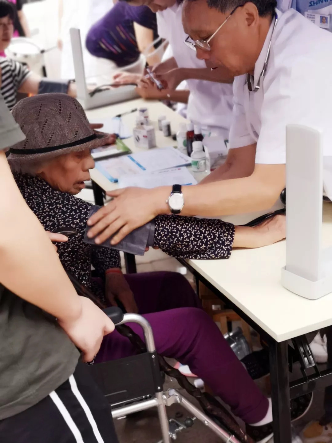 這位坐著輪椅的高齡老奶奶聽說有專家義診團(tuán)來到小區(qū),特意在家屬的陪伴下來到義診現(xiàn)場(chǎng),吳主任親自為老人測(cè)量血壓,并針對(duì)老奶奶家屬反饋的病癥,耐心詳細(xì)的為她解析。